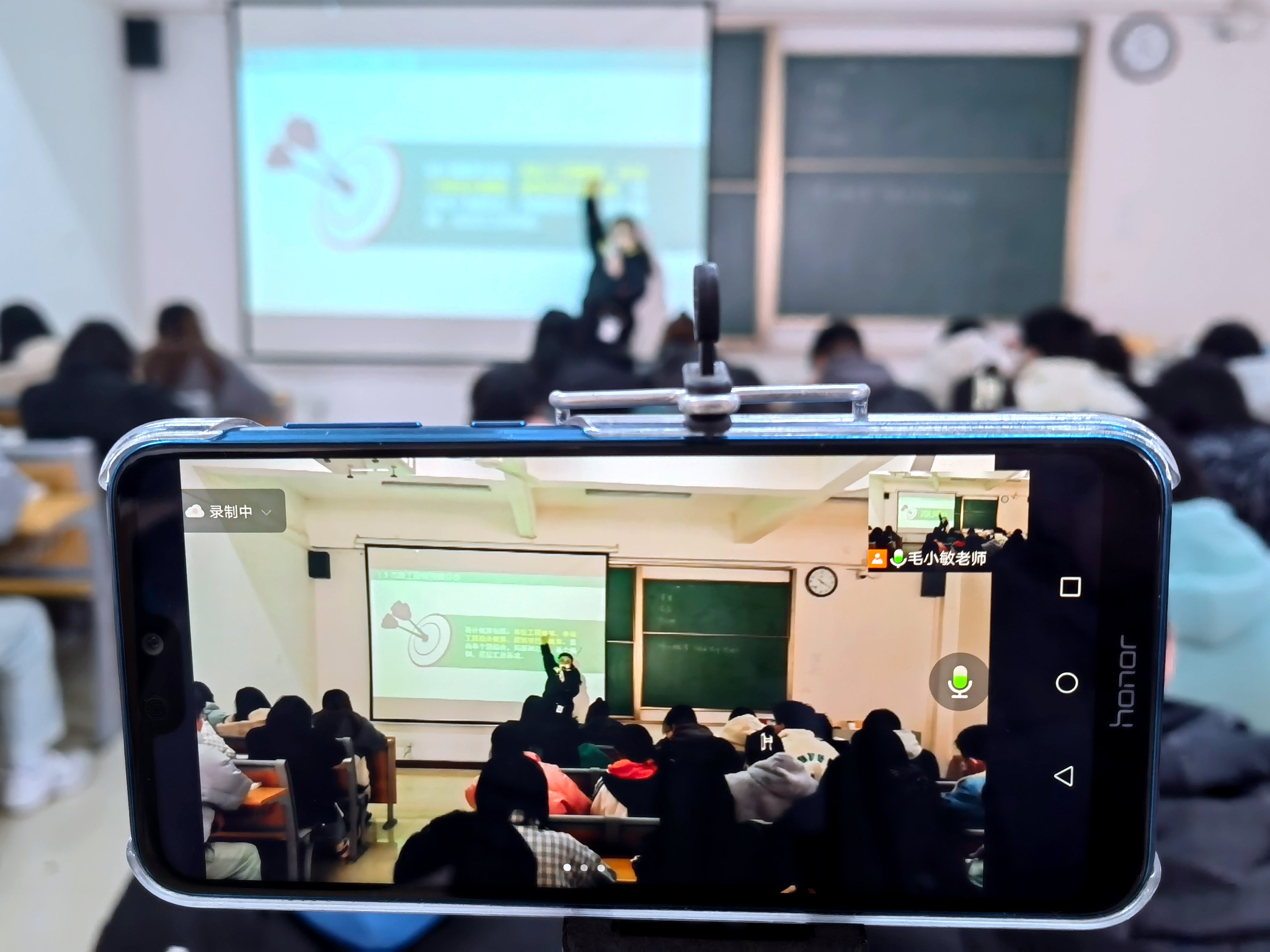 为了开展好线上线下同步教学,毛小敏老师上课前一天就准好好录制设备,将手机和充电宝充满电,并早早的来到教室调试设备,找到最好的机位,生怕在线上课的学生看不清、听不见。“儿子的手机像素好一些,就跟拿来用了。”她还“征用”了自己读高中儿子的手机,自己的手机开展线上互动,儿子的手机则进行课堂直播。“就是想让在家的孩子们也能感受到课堂氛围,尽可能多的让他们参与互动,一个班一起上课,一个也不能落下。”毛老师的随堂测验、课程研讨都是在线上完成,一节课下来在线上课的学生也都挣到了30多个积分,课堂参与率也很高。