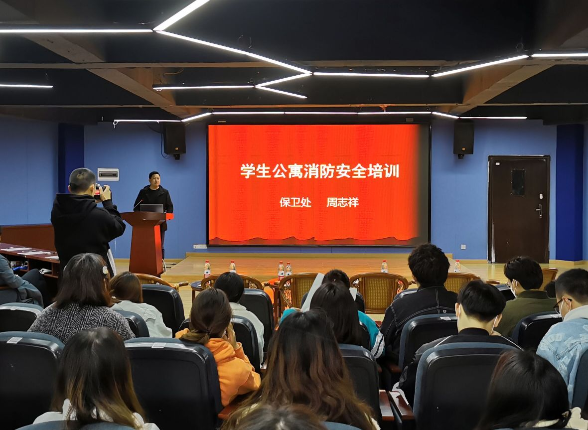 图为消防科科长周志祥为学生开展学生公寓消防安全讲座