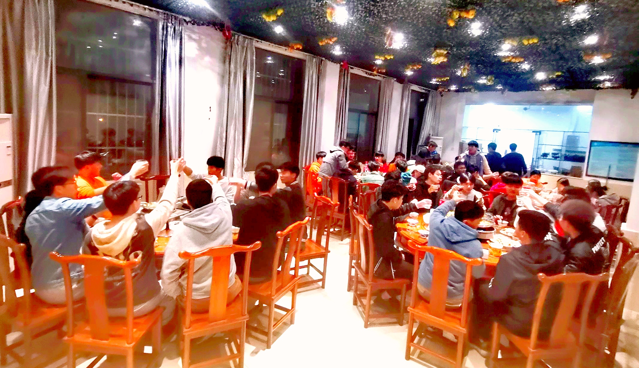 图为班级“火锅宴”师生共同举杯就餐