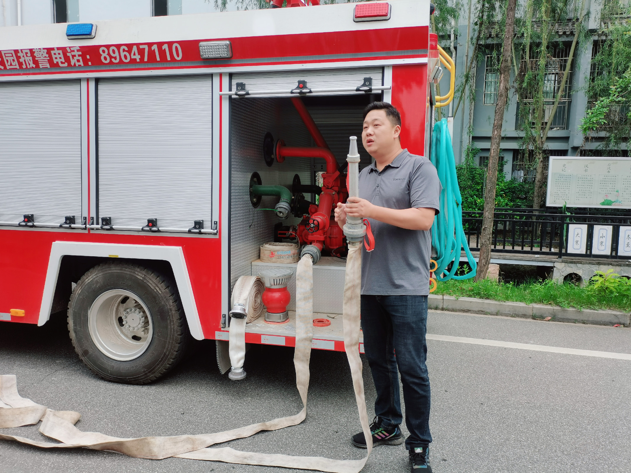图为保卫处周志祥老师指导学院学生掌握消防栓的正确使用方法