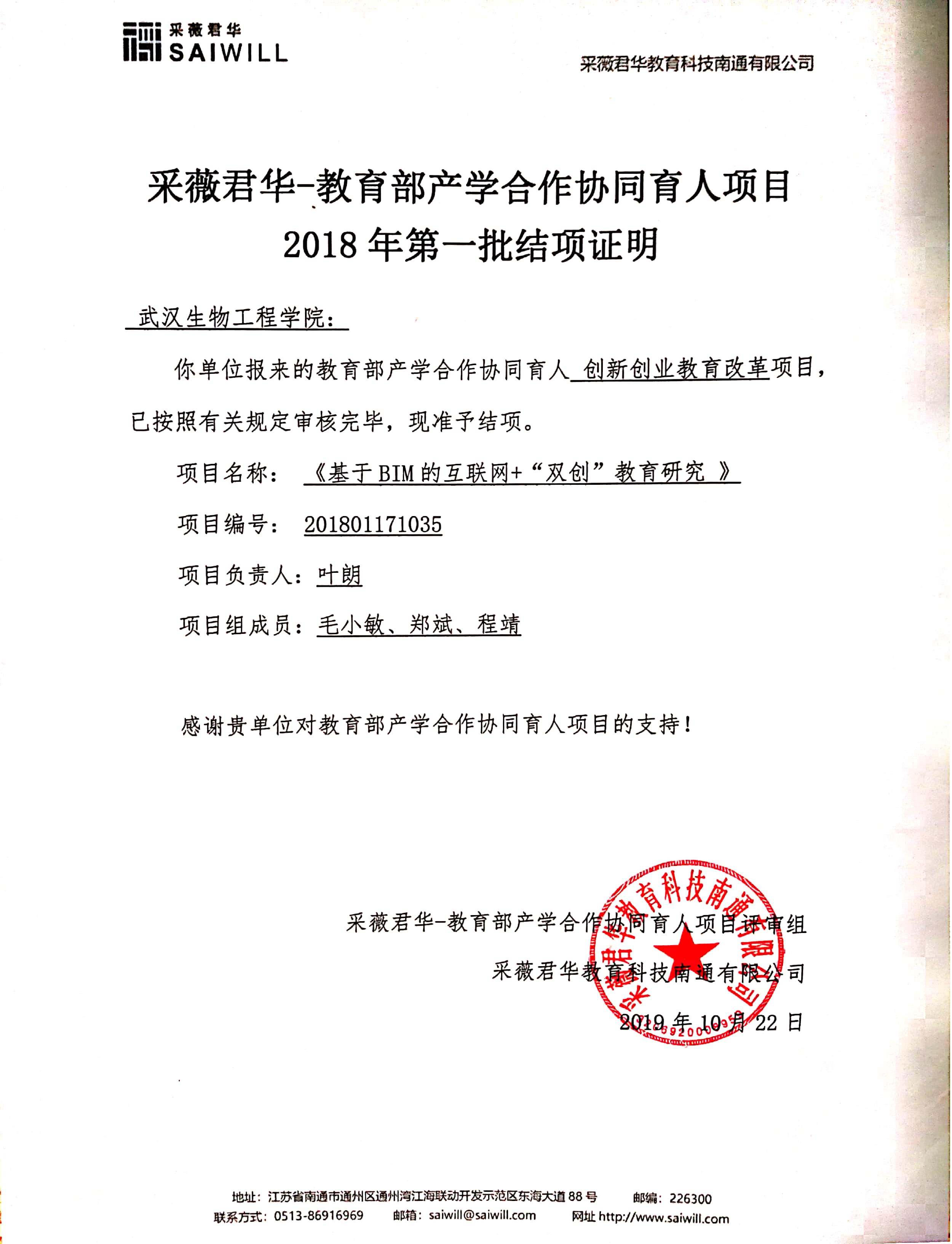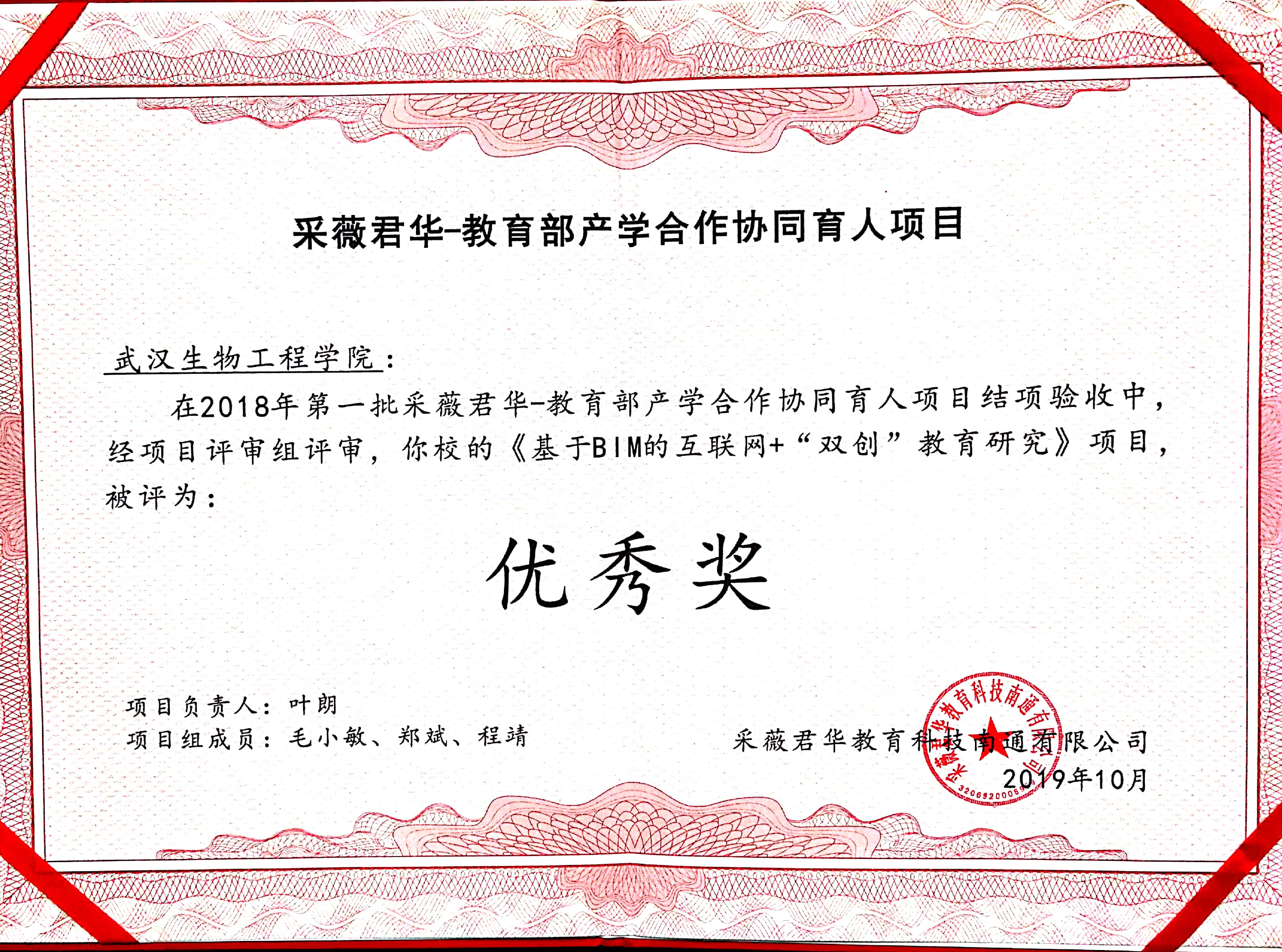 2018年5月,叶朗主持《基于BIM的互联网+“双创”教育研究》项目获得协同育人企业采薇君华教育科技南通有限公司合作立项,邀请建筑学院院长刘怿凡博士、校产学研一体化平台中心郑斌副主任、学院毛小敏副教授和程靖副教授等组成项目团队,针对BIM双创教育的深化开展等问题组织开展研究,项目立项资助金额为3万元,于2019年10月顺利结题。由于疫情影响,项目结项证明及奖项证书于今年6月初才寄达。