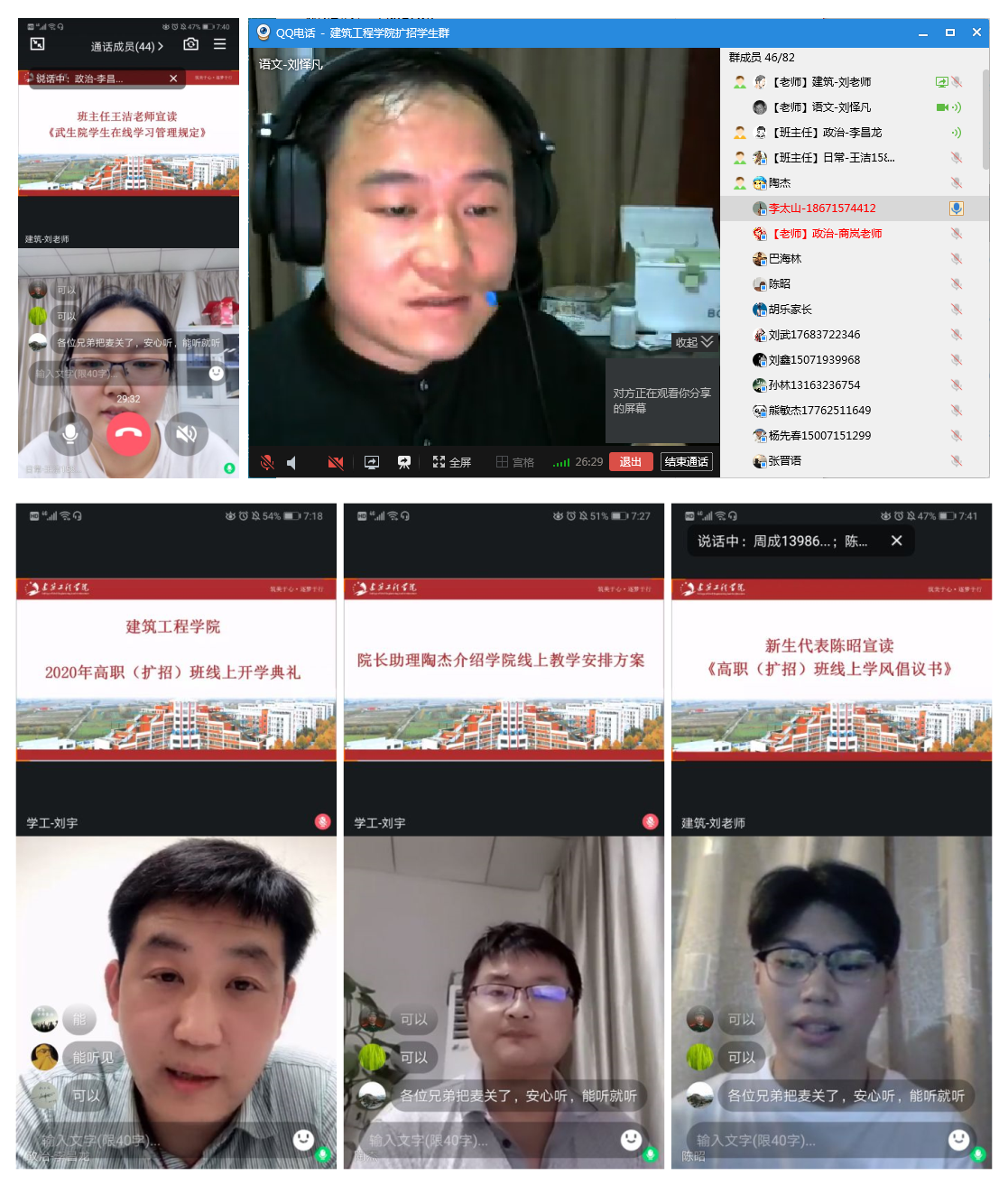 典礼上,院长助理赵雄辉致欢迎辞,他对82名新同学表示热烈欢迎并正式启动学院“空中课堂”,号召全体同学适应新学习模式;院长助理陶杰详细解读了学院线上教学方案,提出个人线上学习方面的要求,指导学习软件的使用方法;学院高职班班主任王洁解读了武生院学生在线学习管理规定;新生代表陈昭宣读了《建筑工程学院高职(扩招)班线上学风倡议书》,倡议同学们要及时调整状态,合理安排时间,主动学习,回归课堂。开学典礼中,学院老师还通过对同学们提出的有关问题一一解答。