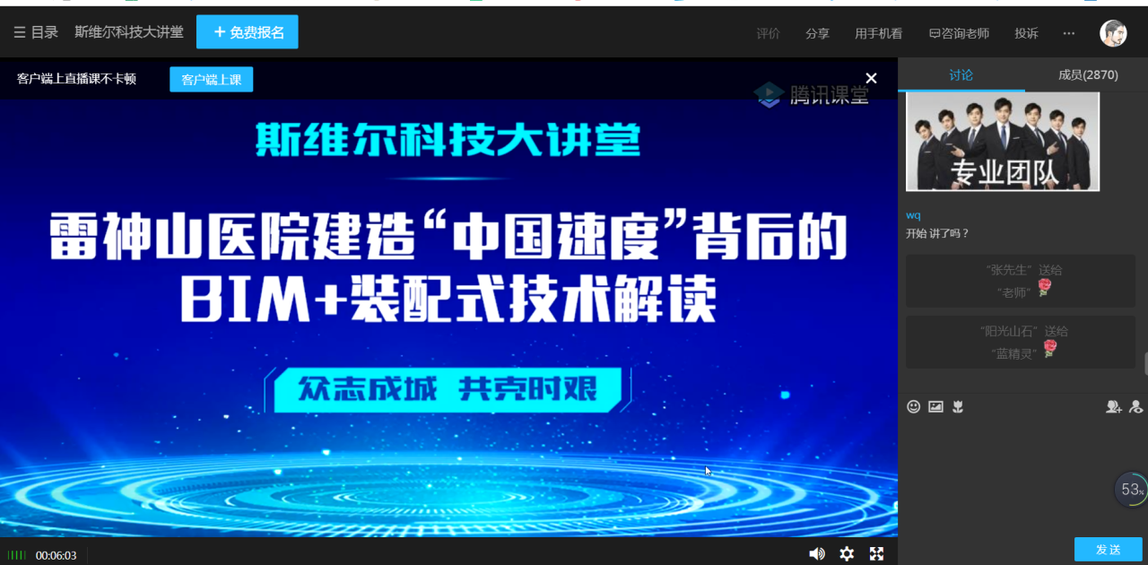 图为“雷神山医院建造‘中国速度’背后的BIM+装配式技术解读”线上公益讲座