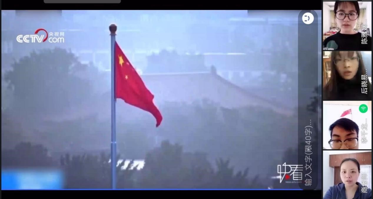 图为动员大会全体成员观看升旗视频、合唱国歌