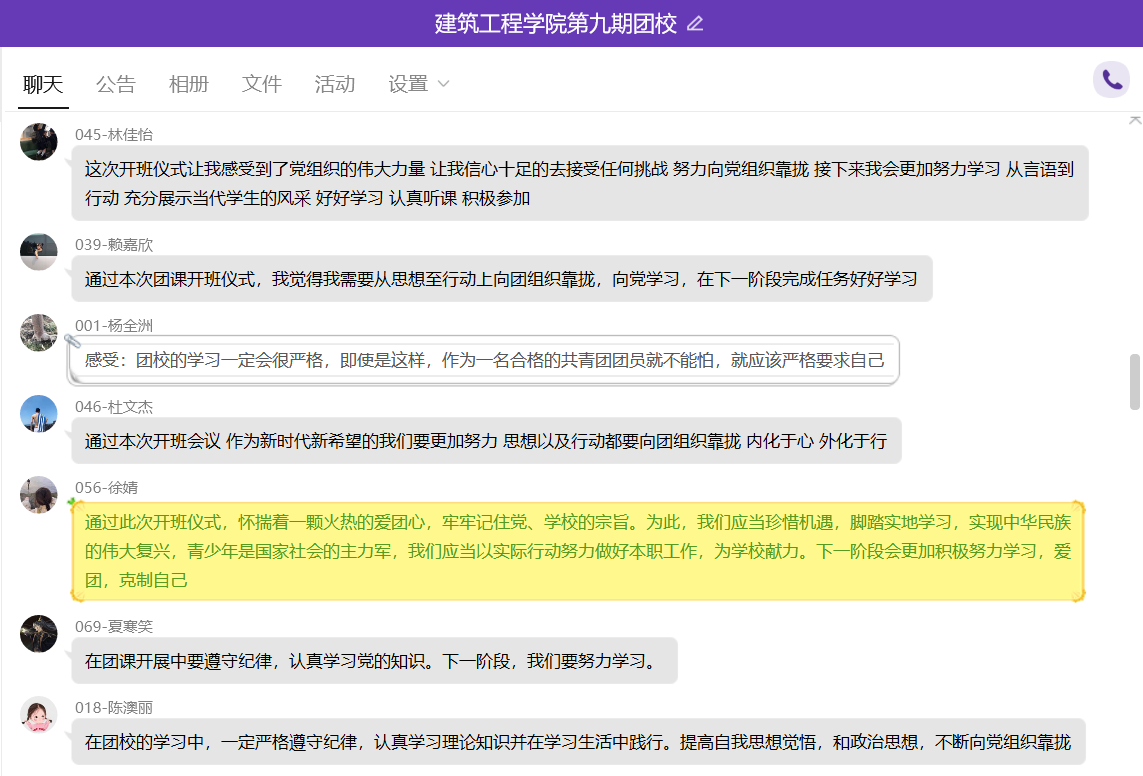 典礼结束后,各学员在线上分享了对开班仪式感受及下一阶段的学习目标。2019级工程造价专科六班学生朱瑞表示:“此次开班仪式让我明白应该严格要求自己,认真学习,积极进取,提升自己的思想与能力,在接下来的学习中我将按时完成要求,遵守规则,让自己有所进步。”