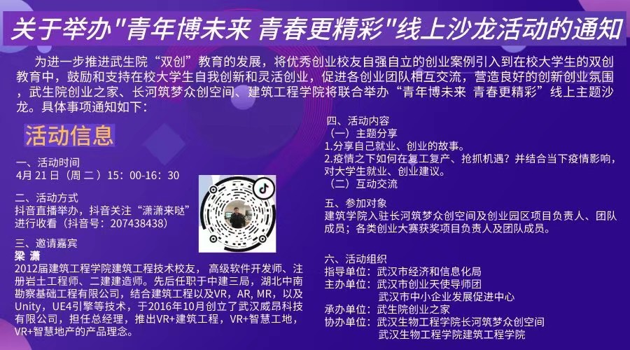本网讯(通讯员 覃祥洲)4月22日15:00,武汉生物工程学院创业之家、长河筑梦众创空间与建筑工程学院联合举办“青年搏未来,青春更精彩”线上主题沙龙。邀请2012届建筑工程学院建筑工程技术校友梁潇作为沙龙嘉宾。建筑工程学院入驻长河筑梦众创空间及创业园区与各类创业大赛活像项目负责人及团队成员参与。