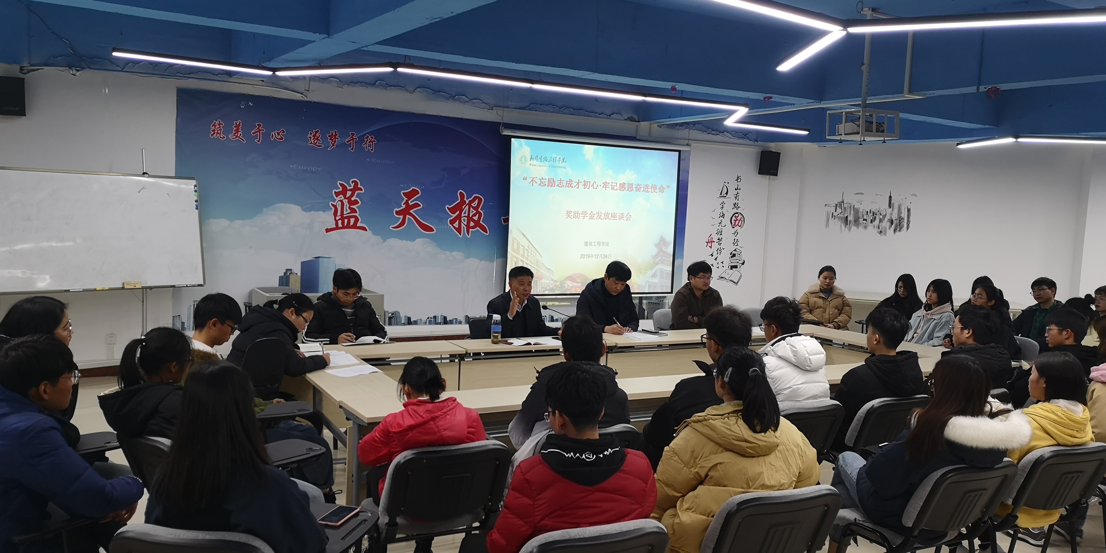 本网讯(通讯员 曹裳)12月24日15:00,建筑工程学院在建筑大楼406蓝天报告厅召开“不忘励志成才初心,牢记感恩奋进使命”国家奖助学金发放座谈会,建筑工程学院党总支副书记李昌龙、院长助理陶杰、分团委副书记佃小东以及35名国家奖助学金获得者代表参加会议。
