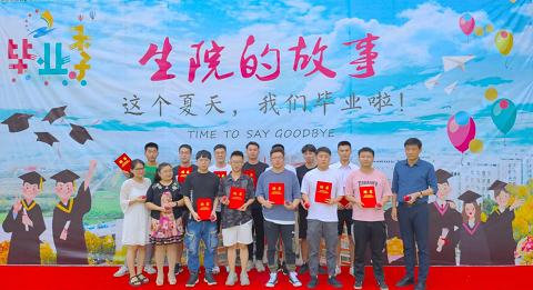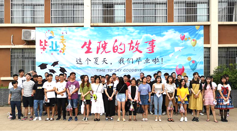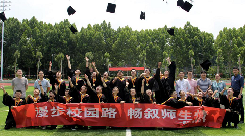 图为学院领导老师与毕业生在健源体育场合影留念