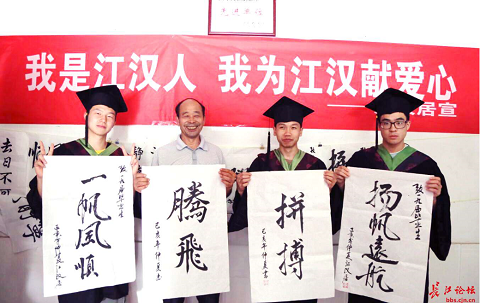 图为江汉居宿管员为毕业生赠送书法作品