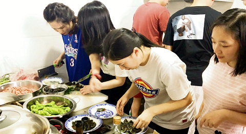 图为毕业生下厨制作毕业晚宴