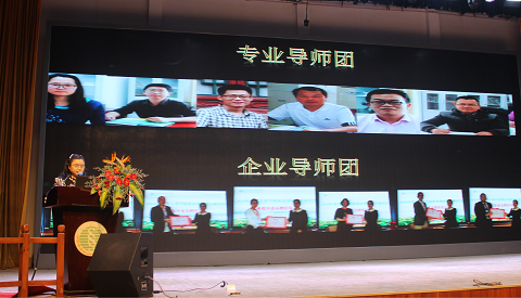 图为聘任的“企业导师”(顺序从左至右)上海望祥钢结构设计有限公司董事长曾今、广州博瑞信息技术股份有限公司总经理张俊涛、湖北省经信委工业志办公室主任梅训安、创高建装股份有限公司董事长程进分别为同学们寄语。