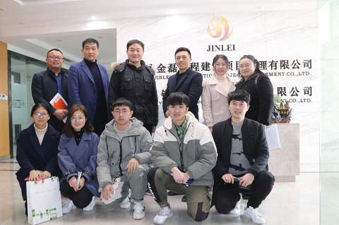图为建筑工程学院领导与湖北金磊工程建设项目管理有限公司负责人及我校实习生合影留念