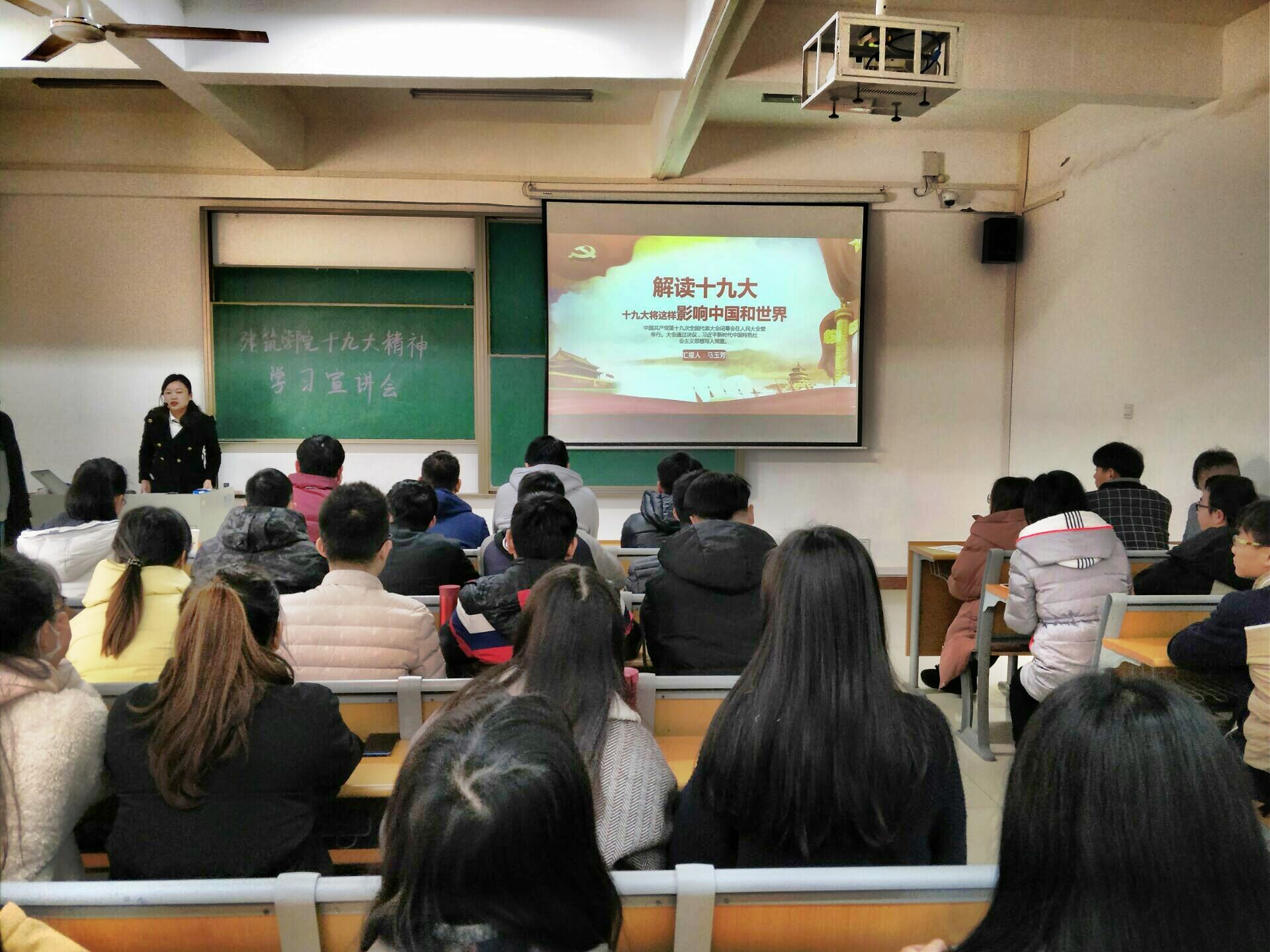 本网讯(大学生记者团 潘绎丞 通讯员 吴凯)1月12日,建筑工程学院党总支书记马玉芳深入学生班级,在建筑大楼15101室开展了党的十九大精神专题宣讲会,马玉芳以“十九大如何影响中国与世界”为题为同学们解疑答惑,现场气氛活跃,掌声不断。