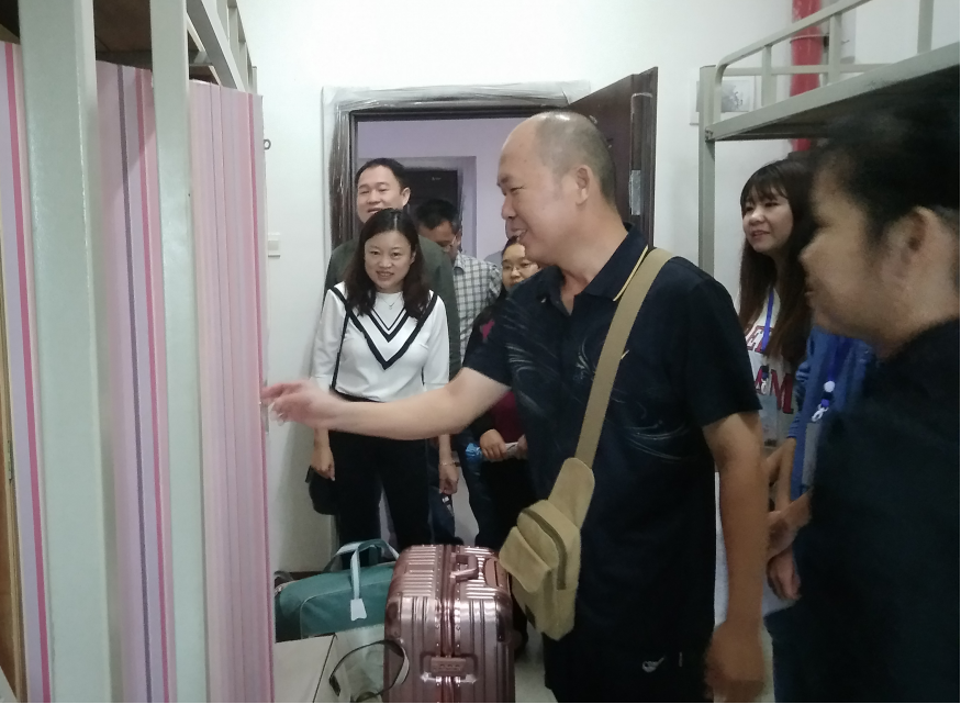 为了让新生来校住得舒适,学院领导亲自检查新生寝室卫生,了解入住情况,并前往提前来校的新生寝室问候家长及新生,并详细询问“对学校是否满意?”、“对新环境是否适应?”、“学校的饭菜是否习惯?”,让学生和家长倍感温暖。海南籍新生赖芸妮和家长才整理好物品,就碰到了刘怿凡等学院领导前来欢迎问候,赖芸妮的父亲对学院领导前来看望表达了感谢,并对学校环境和宿舍条件都表示非常满意。毛小敏、阮中尉等学院领导还向学生家长介绍了专业前景和学院的师资力量,深得学生家长好评。
