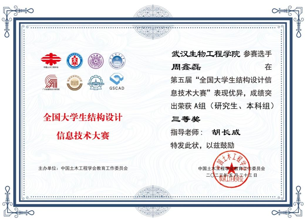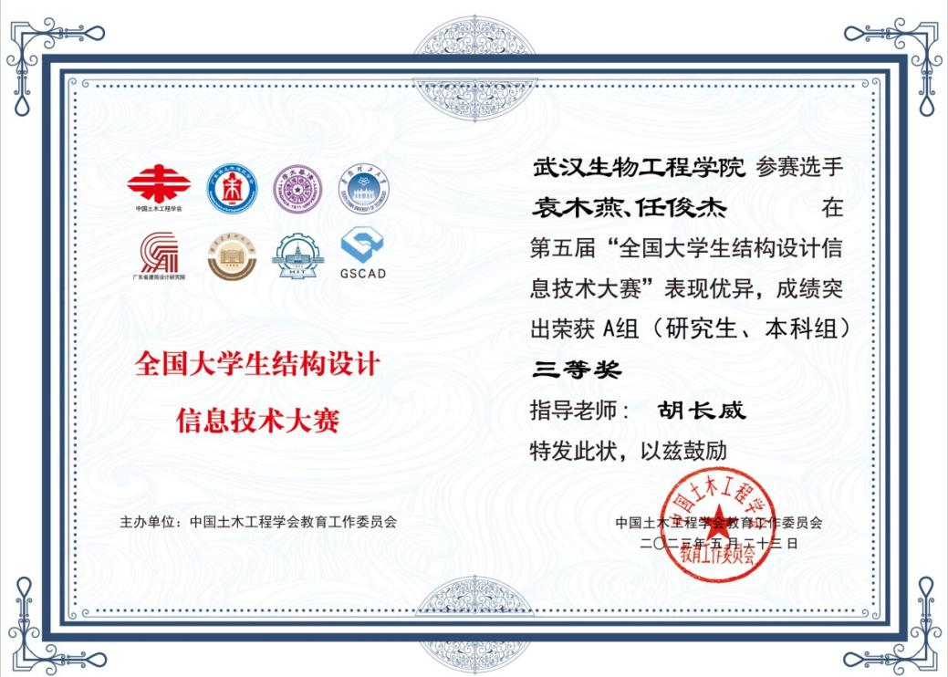 本网讯(通讯员 胡长威 刘佳宁)2023年5月23日,第五届全国大学生结构设计信息技术大赛落下帷幕,我校建筑工程学院胡长威老师指导的刘佳宁获A组(研究生、本科组)二等奖1项,胡成林、周鑫磊和袁木燕、任俊杰团队获得A组(研究生、本科组)三等奖3项。