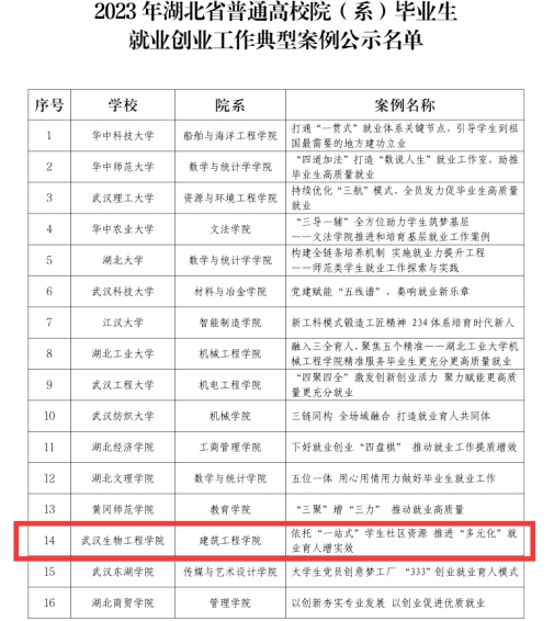 本网讯(通讯员 周涛)近日,湖北省教育厅公示了2023年度普通高校院(系)毕业生就业创业工作典型案例名单,全省共30个院(系)典型案例入选,我校建筑工程学院《依托“一站式”学生社区资源 推进“多元化”就业育人增实效》成功入选。