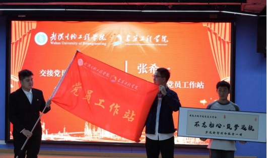 张希一向朱佳安,龚凯凯移交党员工作站旗帜,并赠送“不忘初心·筑梦远航”匾额
