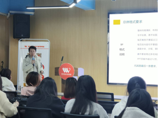 活动现场,周源广从投资亮点、项目概况、市场概况等方面开展项目策划书技巧的培训。列举了瑞幸咖啡等企业的营销策略,为创客们讲授知识,解疑答惑。