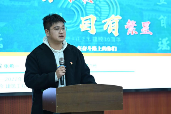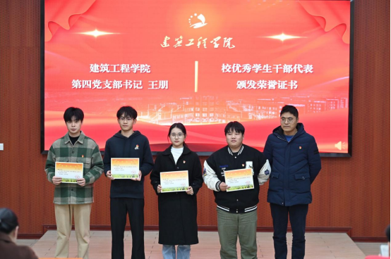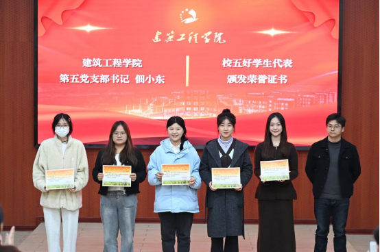 在会上,建筑工程学院党政办公室主任刘宇宣读了综合表彰文件,学院党政班子和各党支部书记为获奖者颁奖。学习进步奖标兵获得者杭行、校优秀学生干部获奖代表张希一、校五好学生代表吴弋羲、国家奖学金获奖代表张雨露在大会上进行了交流发言。他们通过分享自身经历表达了对学院深厚的感情和学院老师、同学帮助成长的感激,表示未来将在更大、更新的舞台继续闪耀、继续炽热,讲好生院故事,赓续生院精神。