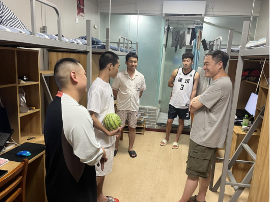 建筑工程学院院长刘怿凡、指导老师陈旭、夏令营政委易帆访寝赠瓜