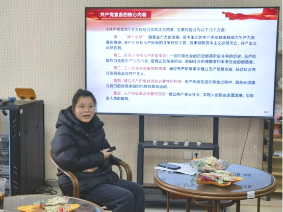 活动现场,徐梦真通过原著分享《共产党宣言》的产生背景,主要内容以及核心思想,结合当前时事,与在场会员研讨资本主义与社会主义的区别以及两个必然的当代理论价值。徐梦真表示《共产党宣言》是马克思主义诞生的标志,学习马克思主义基本理论是共产党人的必修课,这不仅是武装个人头脑的重要理论书籍,更是引导激励一代代共产党人不懈奋斗的精神之本。