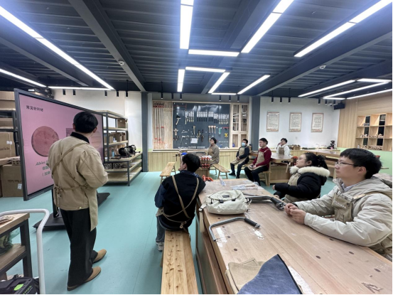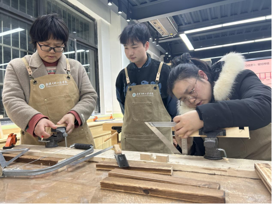 课程教师现场进行木工锯的使用练习和简易榫卯结构的制作