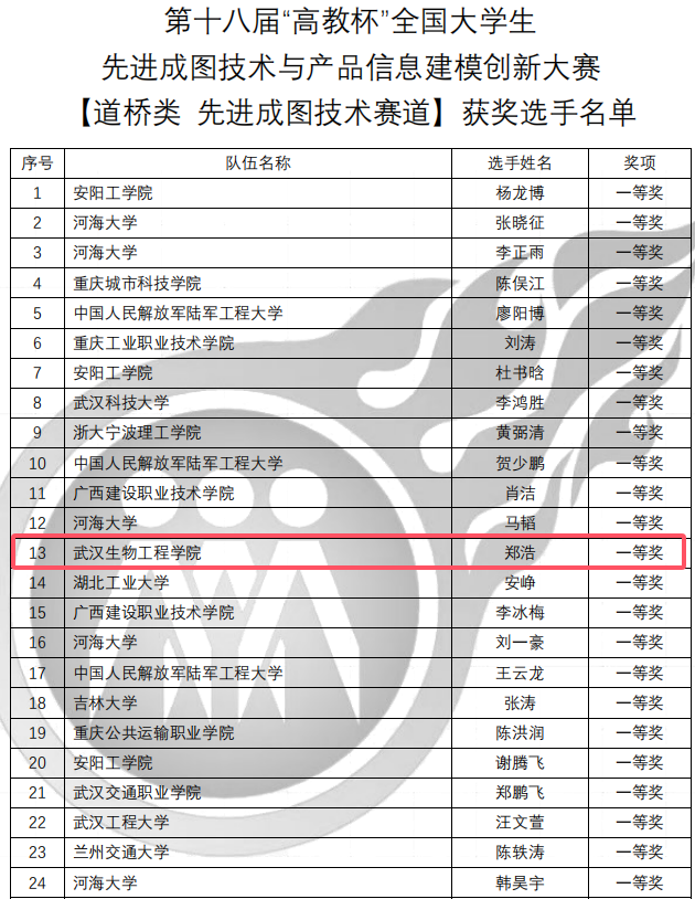 在本届大赛竞争激烈的建筑类赛道中,武汉生物工程学院代表队展现出过硬的技术实力与稳定的发挥,共斩获二等奖2项、三等奖6项,获奖数量与层次均表现优异。而在道桥类赛道的角逐中,勇夺一等奖1项、二等奖1项、三等奖4项。其中,道桥类一等奖的获得者郑浩跻身全国第13名的高位排名,充分彰显了我校在工程图学教育与实践创新能力培养方面取得的显著成效。