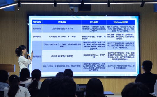 甘春晖老师以“大学生网络违法行为识别与舆情正向引导实务”为主题,结合真实案例,深入剖析了当前大学生群体中易发的网络违法行为及其法律后果。她重点讲解了侵犯隐私权、恶意P图、网络诽谤、煽动对立、散布谣言等行为的违法性质,指出这些行为可能触犯《民法典》《治安管理处罚法》《刑法》等相关法律法规,轻则承担民事赔偿责任,重则面临行政处罚乃至刑事责任。她详细介绍了遭遇网络不良信息或侵权行为时的应对步骤:冷静核实信息源头、理性分析内容真伪、及时通过官方渠道求证,并快速上报辅导员、学工老师和学校保卫处。
