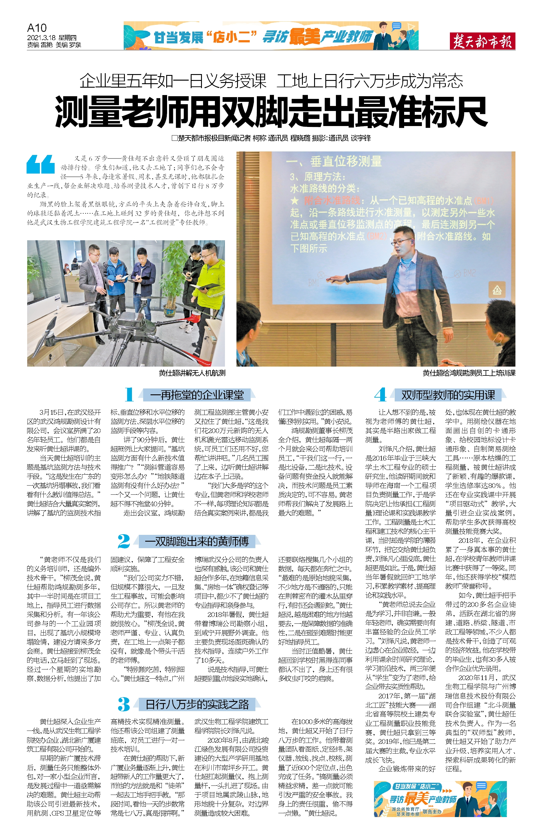 黝黑的脸上架着黑框眼镜,方正的平头上夹杂着些许白发,硕大的球鞋上还黏着些泥土……在工地上碰到32岁的黄仕超,一般人并不知道,他是武汉生物工程学院建筑工程学院一名“工程测量”专任教师。