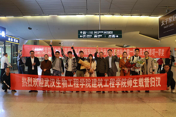 10月31日上午,该校教务处、学生处和建筑工程学院负责人专程到武汉火车站迎接刘群师生,并代表学校对他们取得的荣誉表示祝贺。右六为刘群老师。