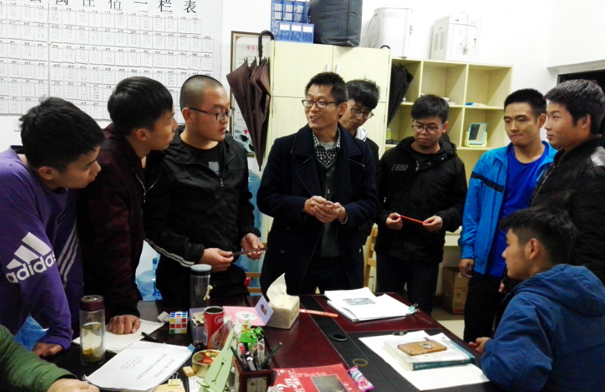 图为黄仕超老师(左四)深入寝室为学生答疑。