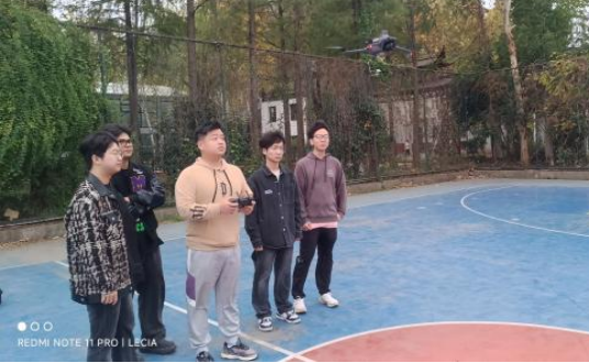 学生在陈想、陈旭老师的指导下练习无人机飞行技巧