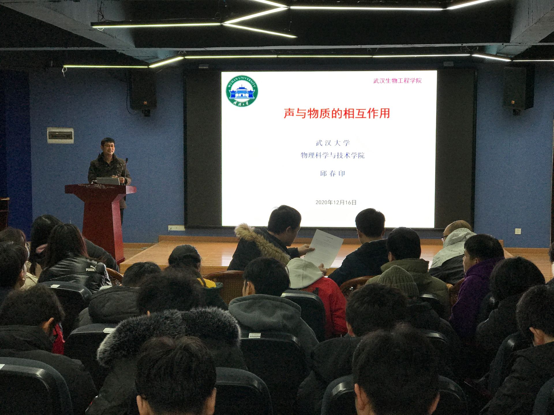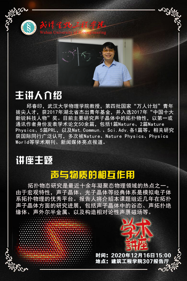 本网讯(通讯员 刘宇)12月16日下午,武汉大学物理科学与技术学院邱春印教授在学校建筑工程学院307报告厅做了一场题为《声与物质的相互作用》的学术讲座,建筑工程学院教师以及各班级学生代表120余人到场聆听讲座。校务委员、建筑工程学院院长刘怿凡博士主持讲座。