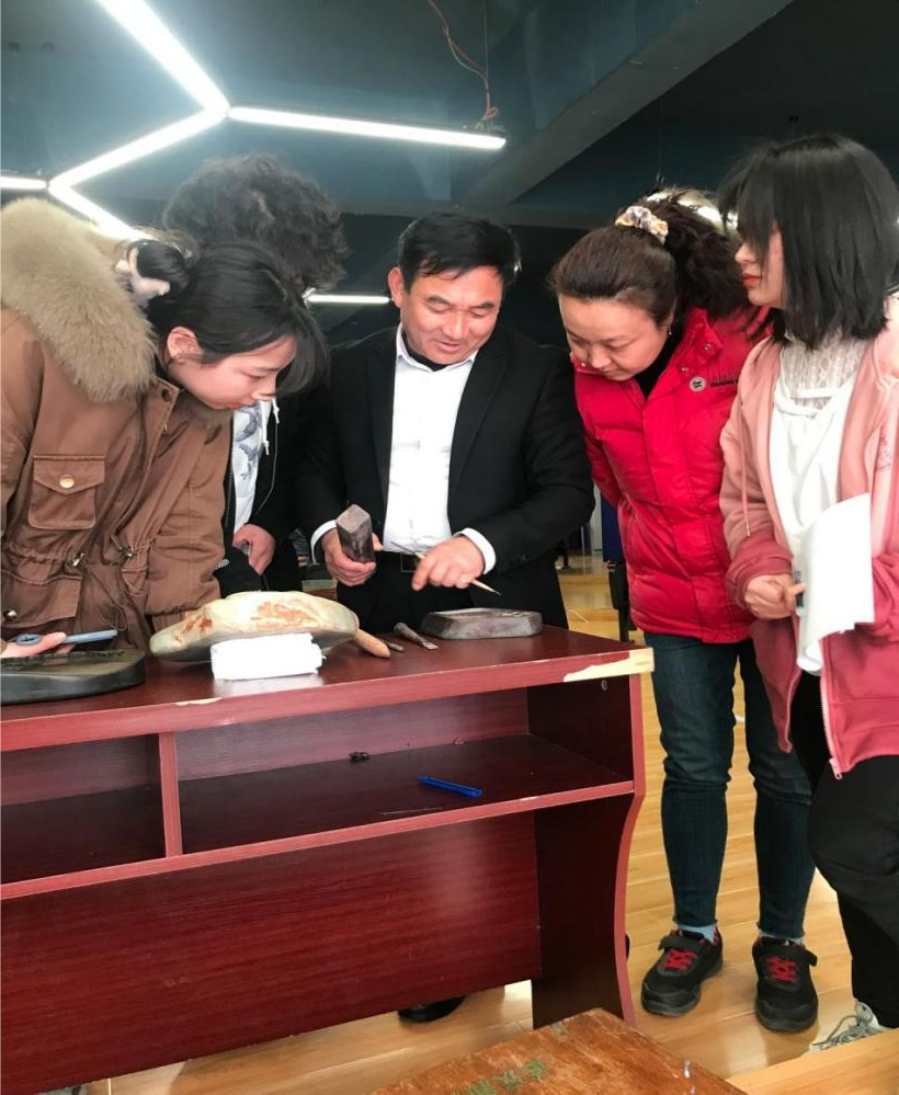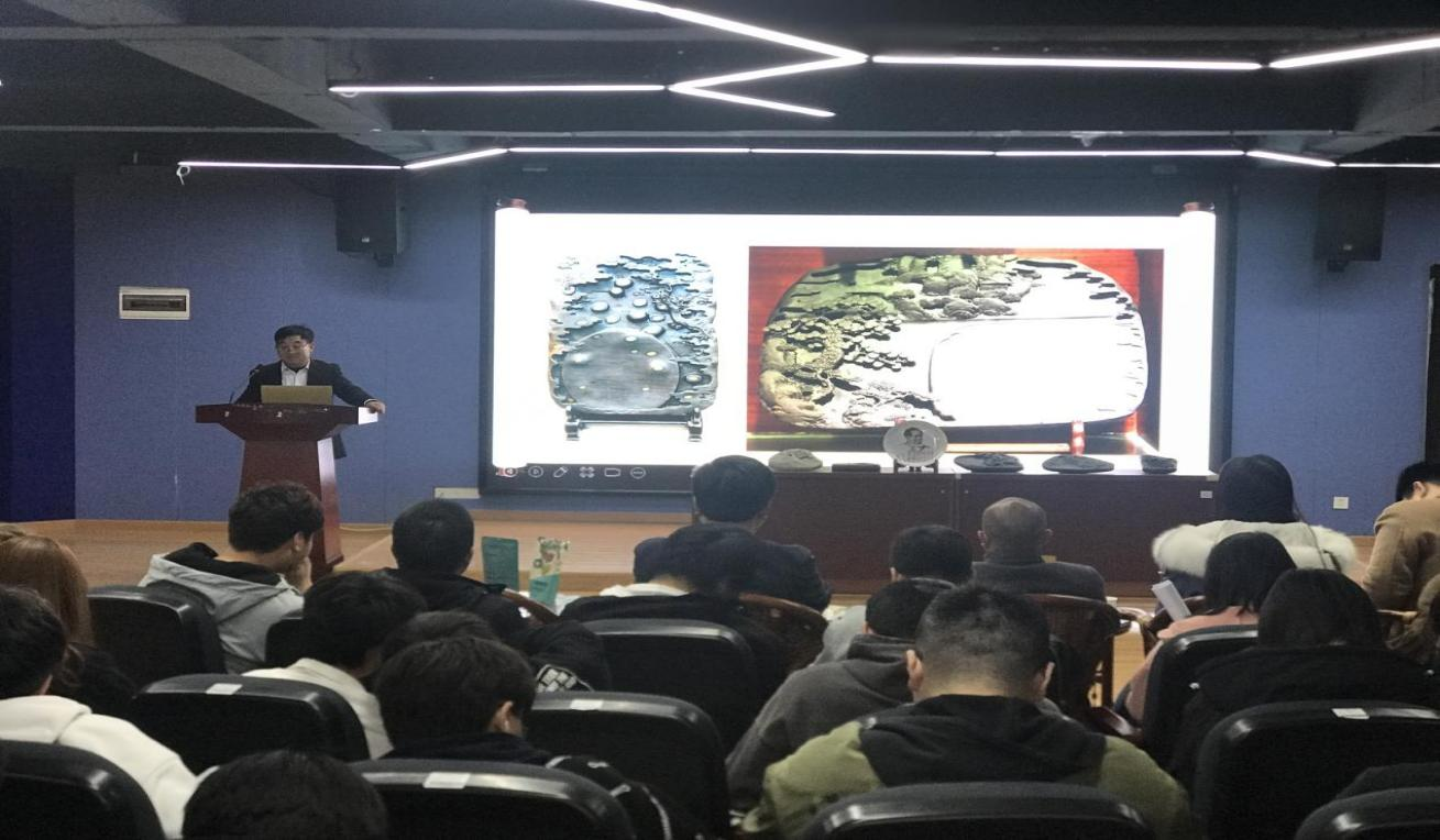 吴和平以《砚雕传承》为题,从砚的起源与发展概述,砚料的发展过程,砚的形制与构成,古代与现代名砚欣赏等几个方面简要介绍了砚台从古至今的发展旅程,并通过自己的艺术发展之路,现场演示雕刻刀法为师生讲解砚的制作技艺。讲座前,吴和平一行还来到学校众创空间木工坊工作室与师生代表交流木雕技艺。