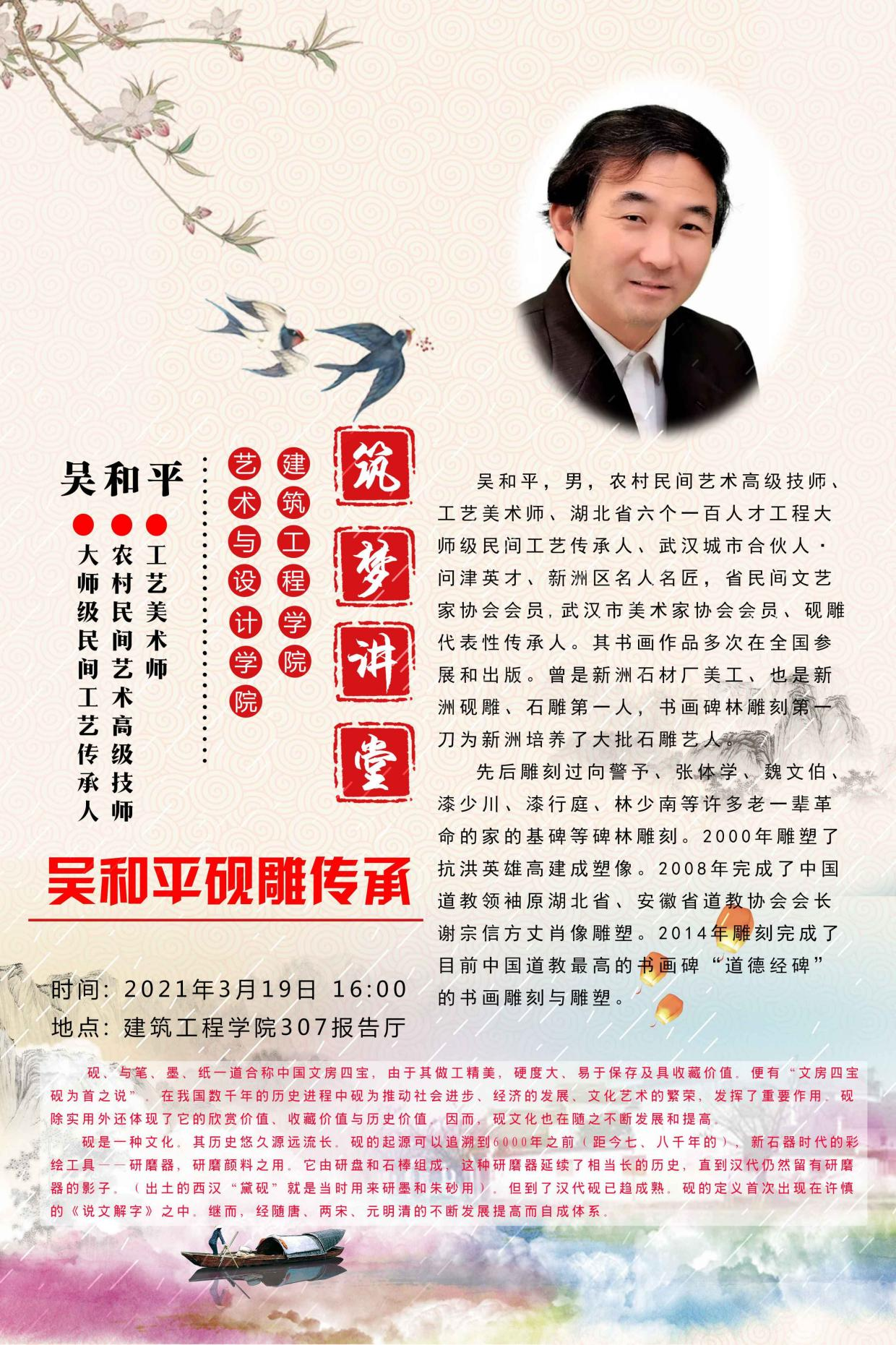 本网讯(通讯员 刘宇)3月19日下午四时,筑梦讲堂在建筑大楼307多功能报告厅开讲。农村民间艺术高级技师、工艺美术师、湖北省六个一百人才工程大师级民间工艺传承人、武汉城市合伙人·问津英才、新洲区名人名匠吴和平主讲。湖北省非物质物化遗产研究中心主任郑君波,原新洲区党委宣传部副部长罗志超和艺术与设计学院、机械与电子工程学院、建筑工程学院等三个学院师生代表150余人参加此次活动。讲座由校务委员,建筑工程学院院长刘怿凡博士主持。