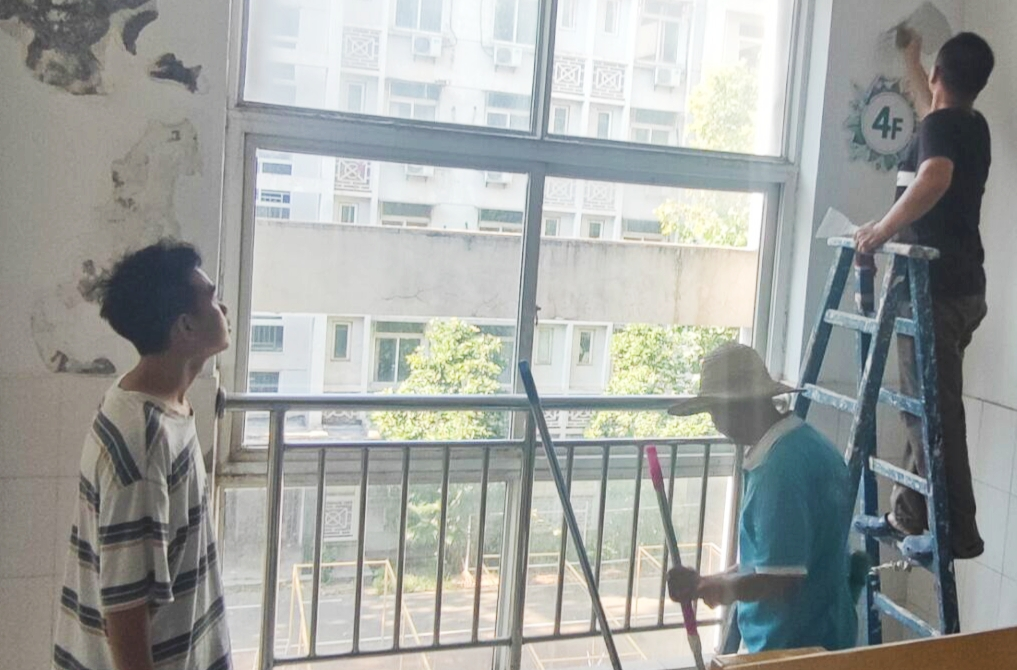 “筑梦双创”夏令营施工组韦建业监督工人修补翠微居楼梯间墙面