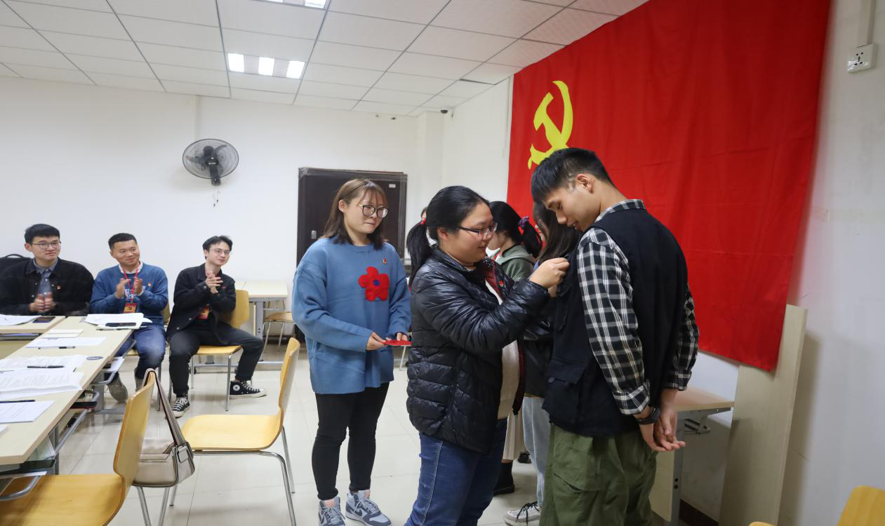 图为第二党支部书记王洁老师为此次会议接收的预备党员佩戴党徽