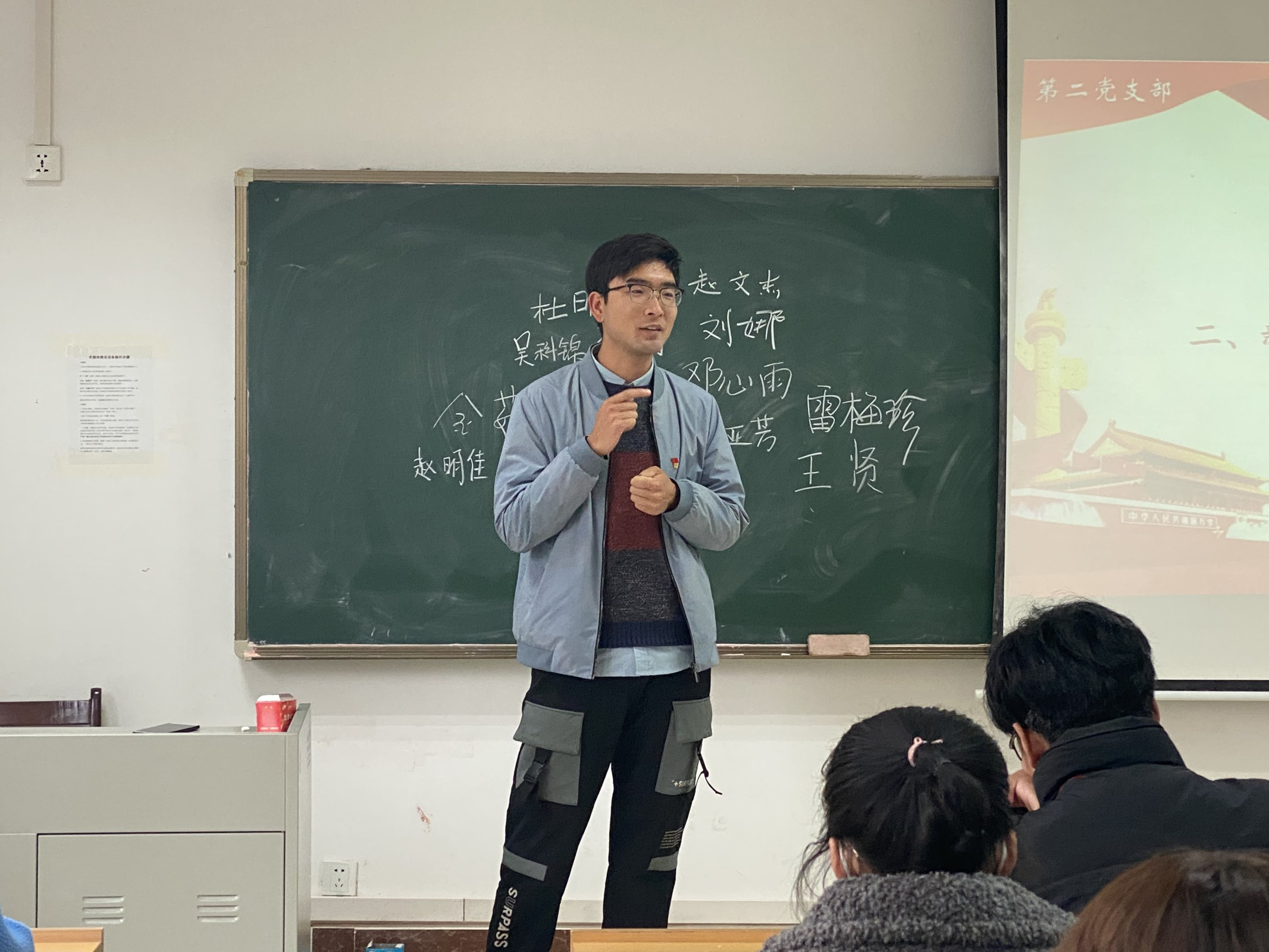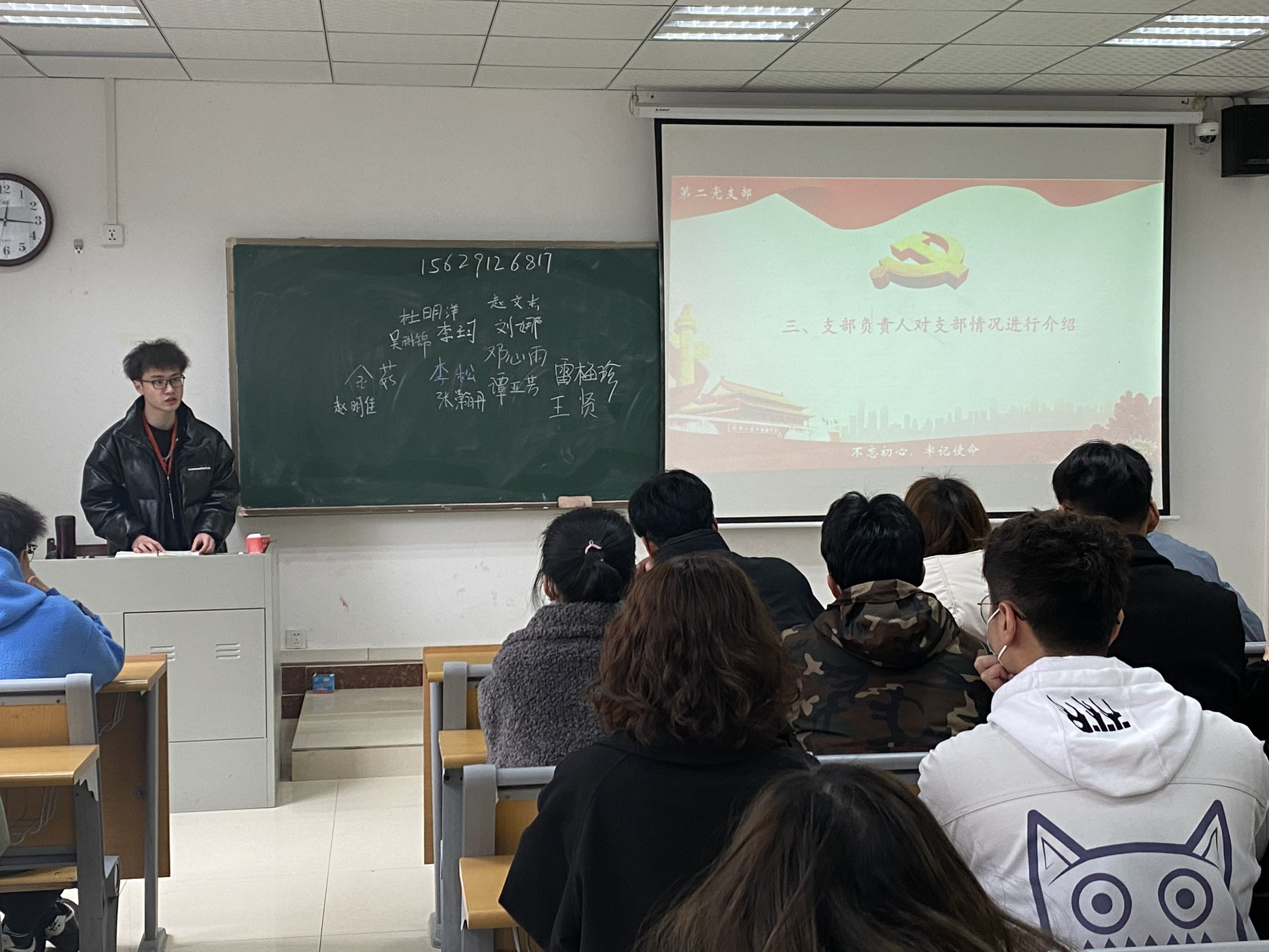 19级、20级共14名新同志在本次例会中一一进行自我介绍,并且借此机会谈了自己对党的认识。 大部分同志对党充满了好奇心,想要加入党站深入了解,学习更多党的有关知识,从而锻炼自己为人民服务。随后,支部负责人童铂钞对第二党支部的情况进行了详细的介绍,支部内计录员、宣传员、督察员、支部助理也上台进行了自我介绍,并在支部内进行职位纳新。