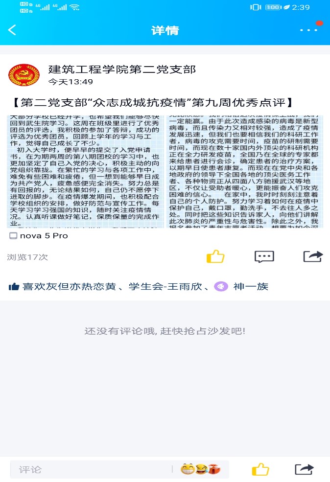 本网讯(通讯员 徐浩然)在举国上下抗击疫情期间,建筑工程学院第二党支部在线上开展了“学习强国”APP学习与防疫知识学习心得分享会活动,第二党支部入党积极分子、发展对象、预备党员、党员参与,入党申请人选择性参与,现已开展至第九期。