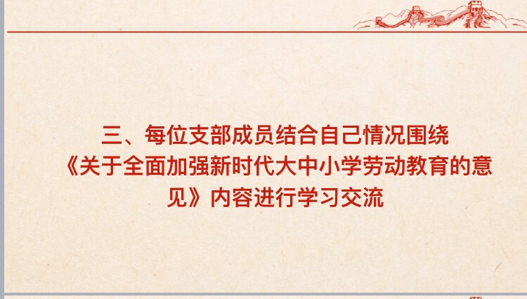 此次活动以全体成员线上学习《学习关于全面加强新时代大中小学劳动教育的意见》视频的形式开展,在各成员自主学习完成后,各成员结合自己情况围绕关于全面加强新时代大中小学劳动教育的意见内容进行学习交流、分享体会。