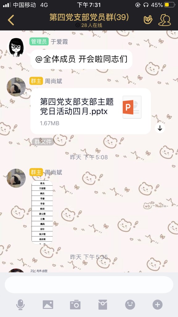 本网讯(通讯员 朱子健)4月28日下午17时,建筑工程学院第四党支部在线上开展学习《关于全面加强新时代大中小学劳动教育的意见》主题党日活动,第四党支部全体党员、预备党员参加。