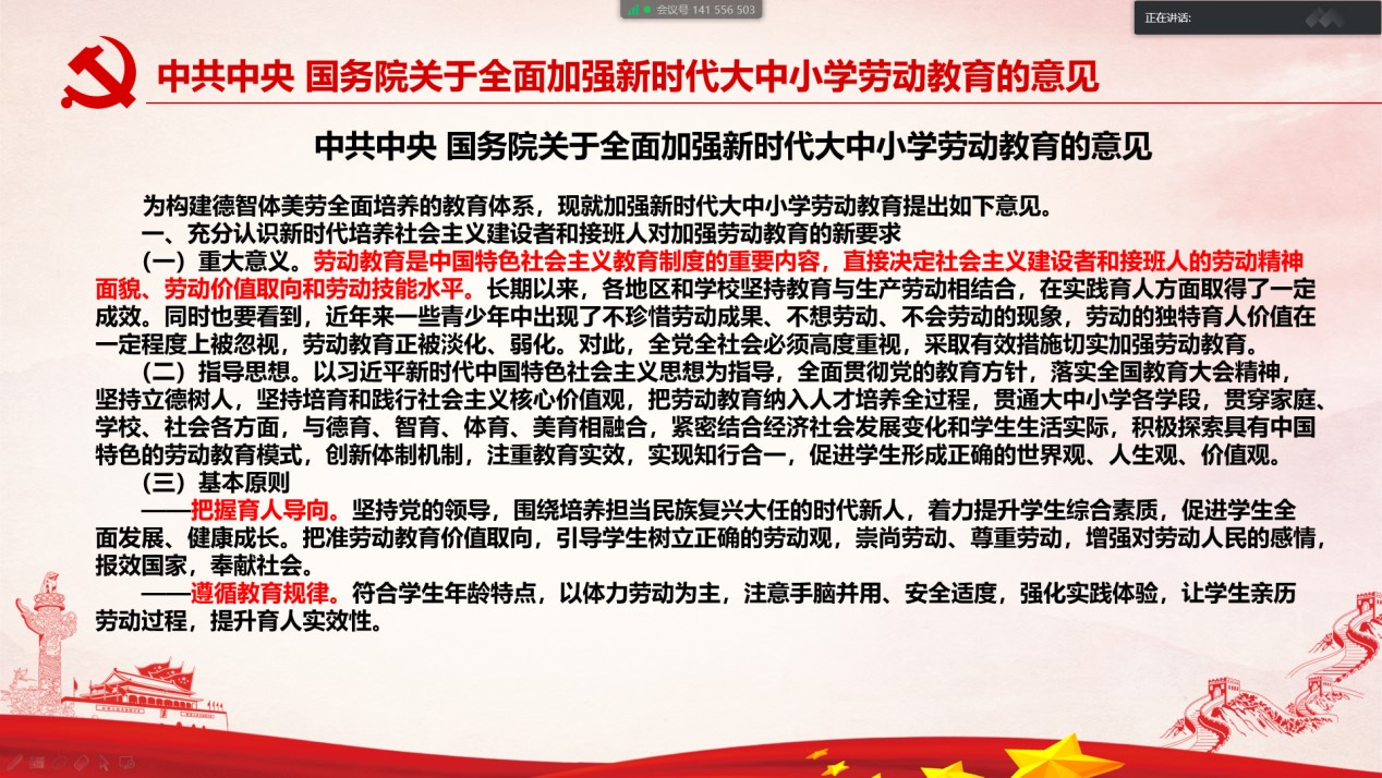 第三党支部集中开展了“落实劳动教育精神,我们正在行动”的主题学习活动。支部成员认真学习了《关于全面加强新时代大中小学劳动教育的意见》的具体内容,并决定将其落实到现实生活中,带头践行劳动育人。个别成员对《关于开展第32个爱国卫生月活动为全面打赢新冠肺炎疫情阻击战营造良好环境的通知》和《动员广大群众积极参与爱国卫生运动》发表了自己的意见:“要充分认识新时代培养社会主义建设者和接班人对加强劳动教育的新要求,全面构建体现时代特征的劳动教育体系,广泛开展劳动教育实践活动,着力提升劳动教育支持保障能力,切实加强劳动教育的组织实施”。