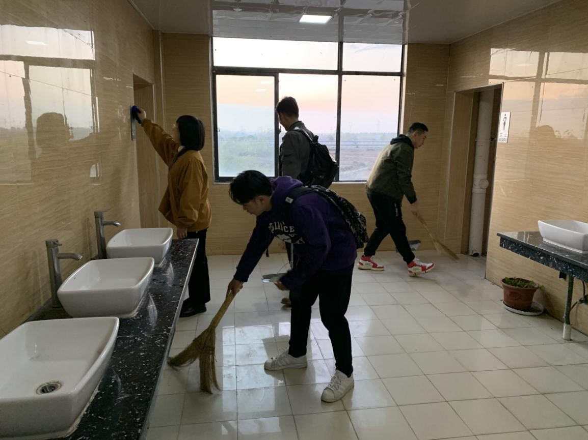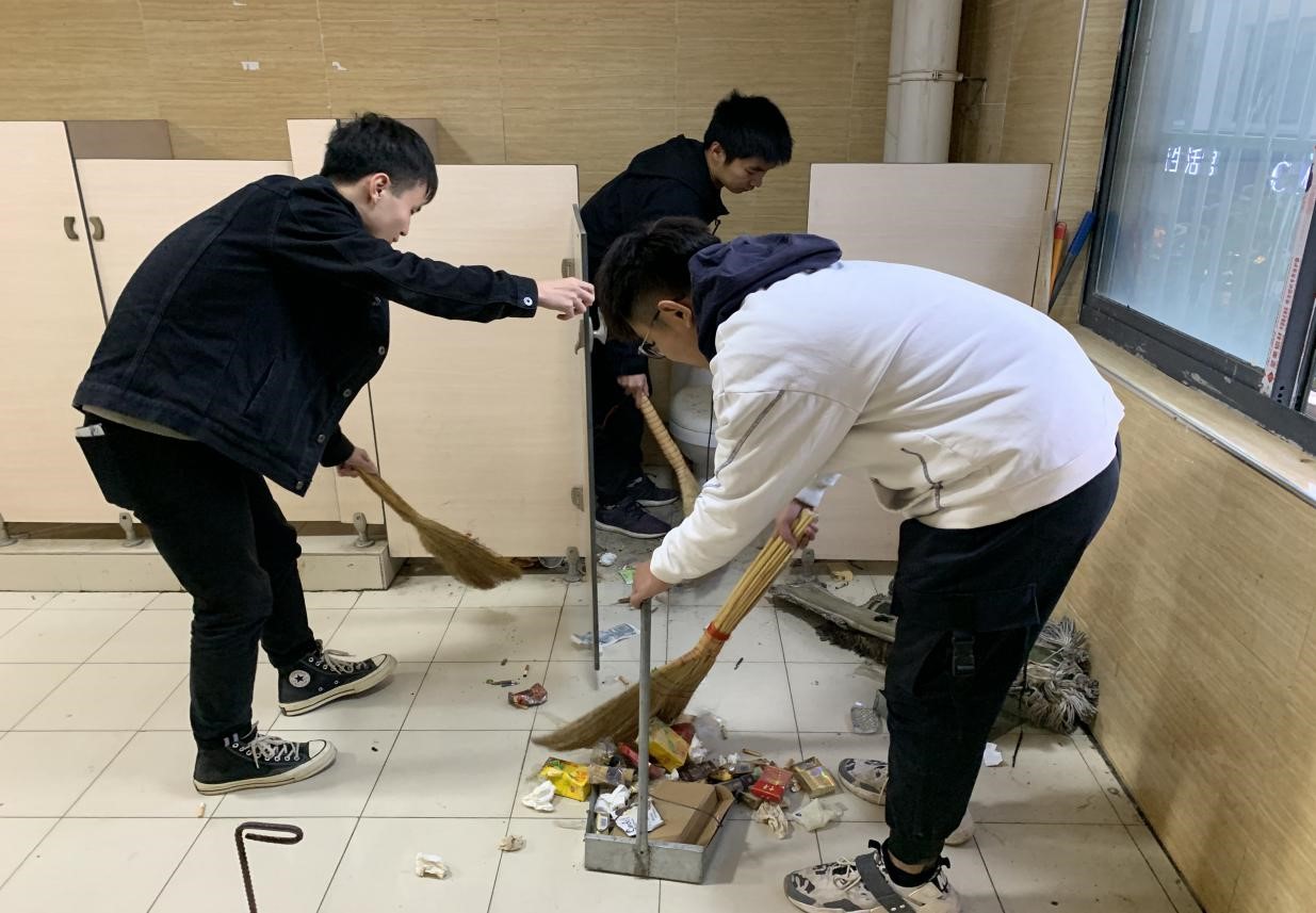 图为第二党支部预备党员打扫卫生间卫生并擦拭禁烟标识