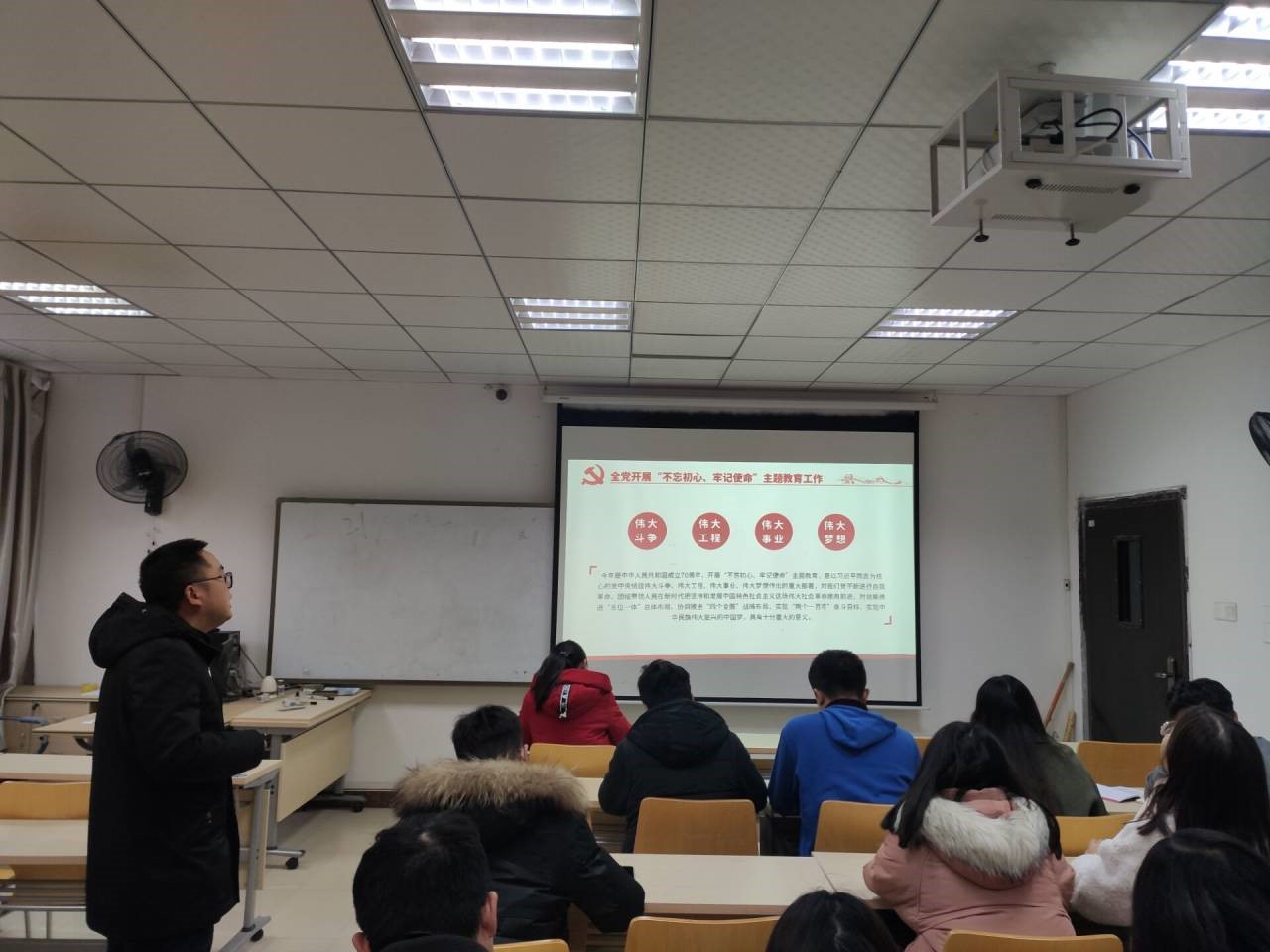 本网讯(通讯员 黄华锋)2019年11月27日下午4点,建筑工程学院第一党支部于15105开展了“不忘初心牢记使命”主题教育解读。本次活动由支部书记夏迁老师主讲,第一党支部全体在校学生参与。