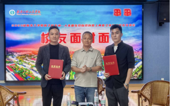 图为学院党总支书记王龙为吴应甲、郑文欢两位校友颁发人生赢在双自双创路上青春之旅优秀校友交流会参与证书