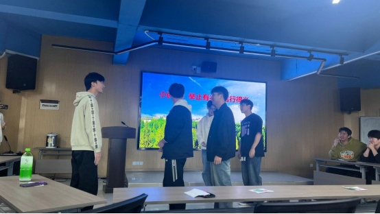 班会伊始,徐梦真老师通过水果卡片给学生们分组,分为大西瓜组、小苹果组,banana组、big橘组、超级无敌大个儿葡萄组、小梨子组等。接着对应各组下发“诚实守信,严于律己”、“举止有礼,言行得当”、“安全出行,文明交通”3个场景任务和要求,各组按照规定的时间进行准备和呈现。学生们充分发挥想象力和表演力,通过场景还原再现考场抄袭、上课玩手机、不认真听课等现象,使得在场学生捧腹大笑的同时,也引发其思考。学生还通过模拟食堂打饭、宿舍玩手机等场景,将诸多平时生活习惯中的“小毛病”通过模拟、对话等形式进行等比例放大,让学生们在欢乐的氛围中感受到举止有礼、言行得当的重要性。在“交通安全”主题的表演中,学生们通过模拟日常生活中的交通场景,如过马路、骑自行车等,形象地展示了遵守交通规则的必要性以及不遵守规则可能带来的危险后果,给在场师生敲响了交通安全的警钟。