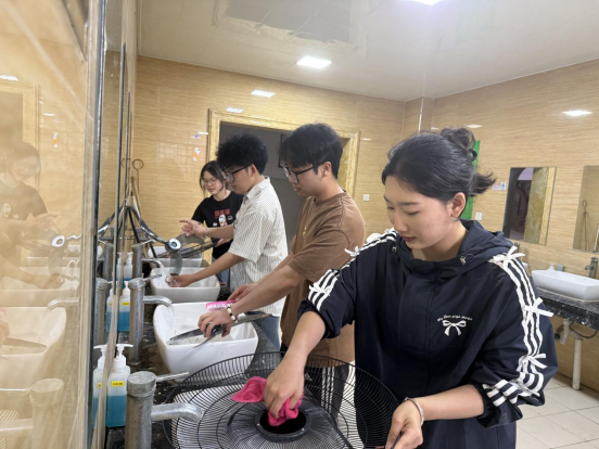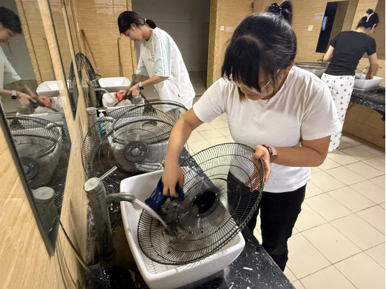 活动前,将12人分为 3 组,并为每人指定工作内容。男生主要负责拆卸扇叶和防护罩,女生主要用抹布和刷子仔细处理电扇污渍,最后大家一起做收尾工作。 即便面临工具简陋、电扇污垢严重等难题,大家热情不减,抹布反复拧洗,刷子不断洗刷,始终干劲十足。