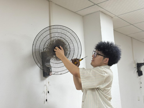 当晚21:00,随着最后一台风扇调试运转,清洁任务圆满收官。焕然一新的风扇不仅消除噪音隐患,连风扇罩网格都洁净如新。参与此次风扇焕新活动的黄斌同志感慨颇深:“长这么大,我在家都没拆洗过电扇,这次在活动中跟着大家学习,不仅掌握了拆洗技巧,还意识到定期清洁的重要性!”