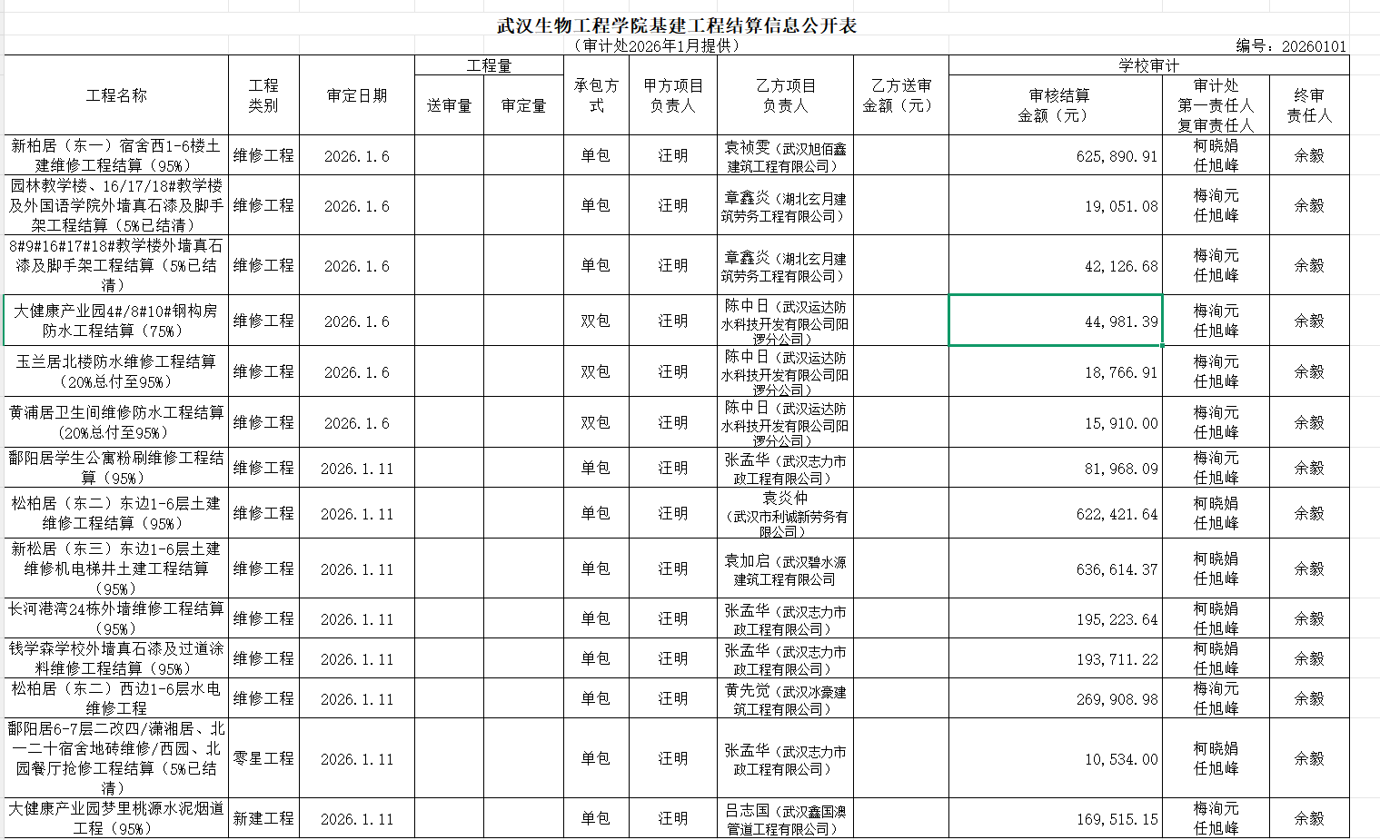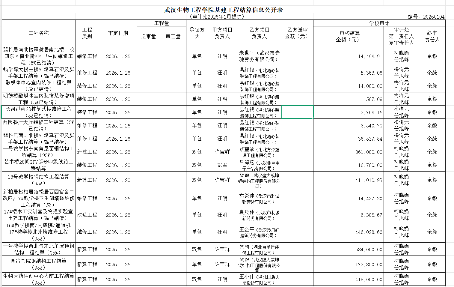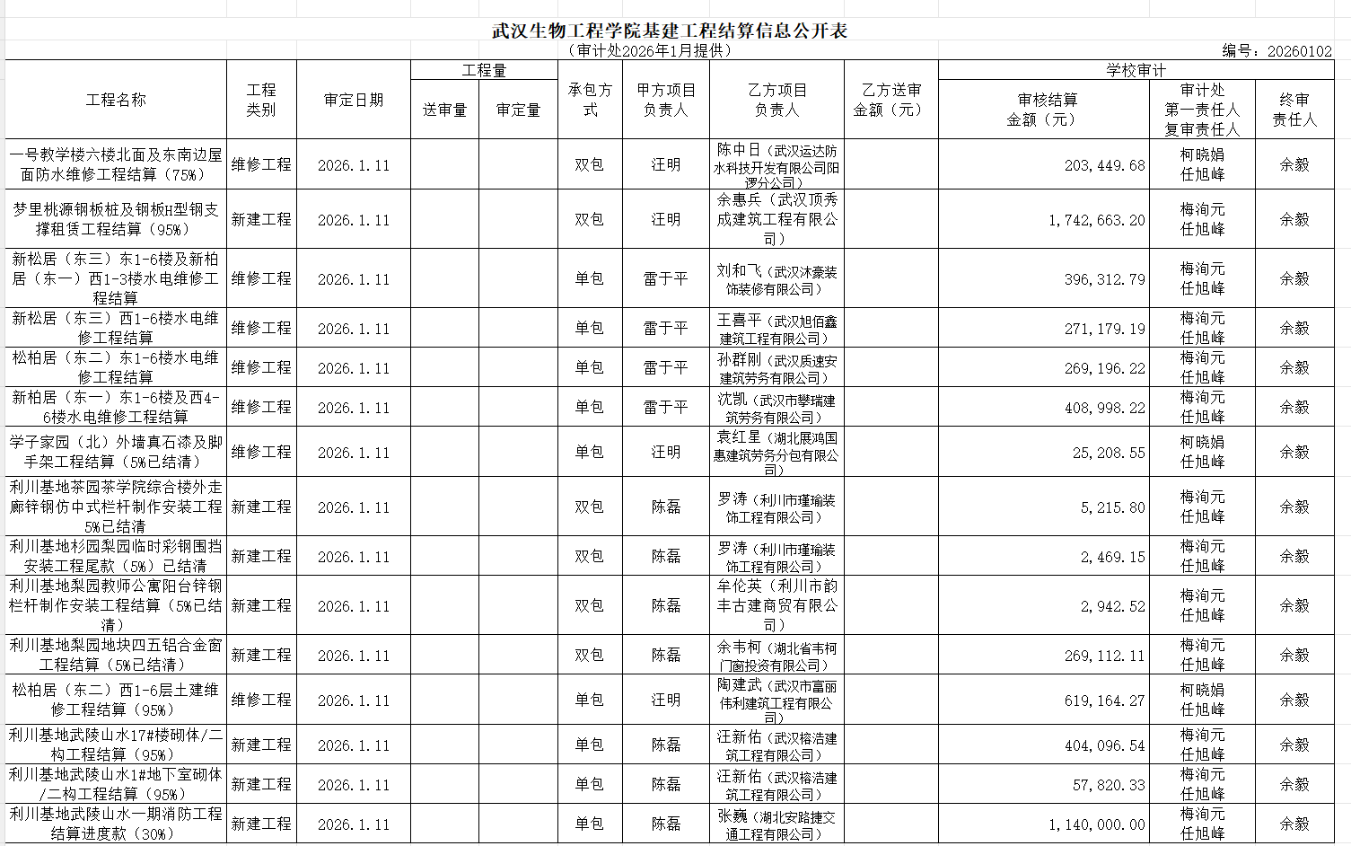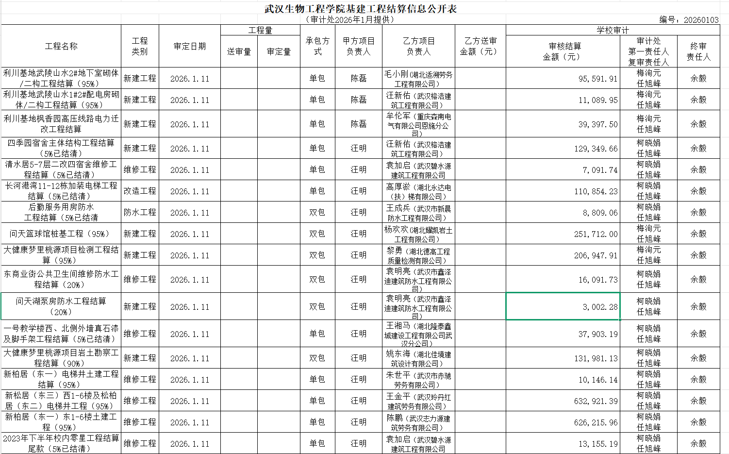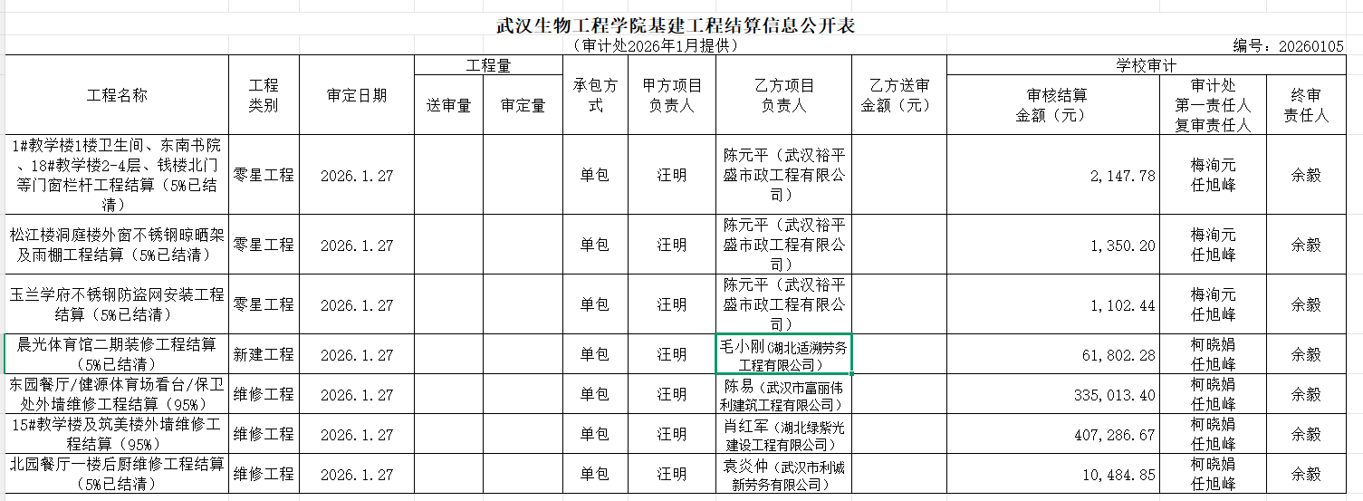 工程结算审计公示(2026年1月)