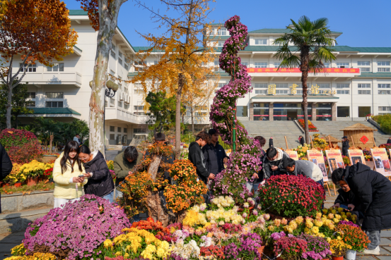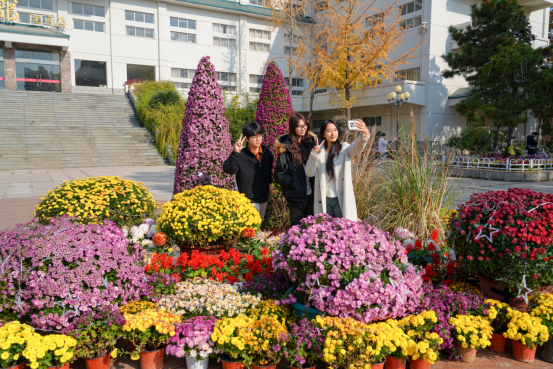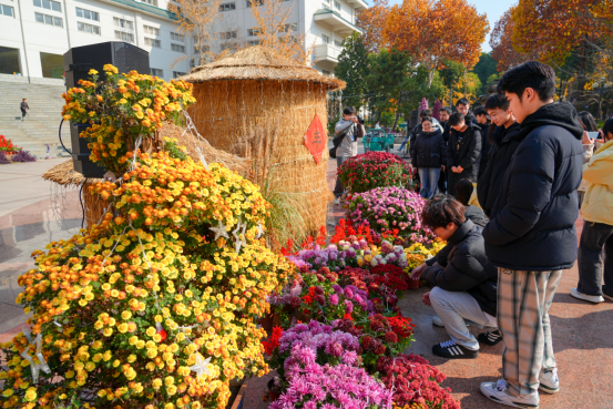 菊景与校园秋景相映成趣,吸引学生纷纷拍照打卡